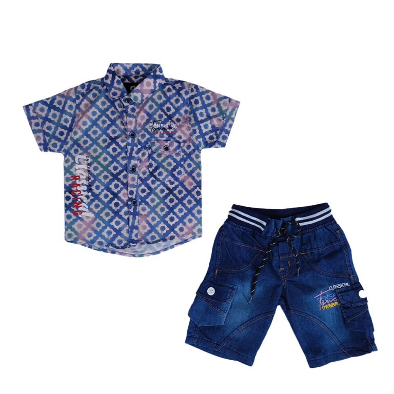 Boys’ Printed Blue Shirt and Denim Shorts Set – Summer Outfit